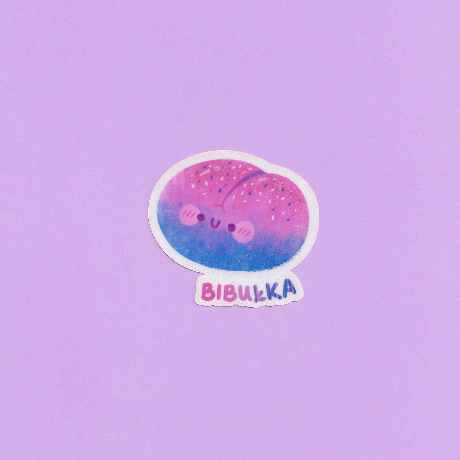 Biseksualna Bibułka to naklejka przedstawiająca flagę biseksualności w formie uroczej kolorowej bułki.