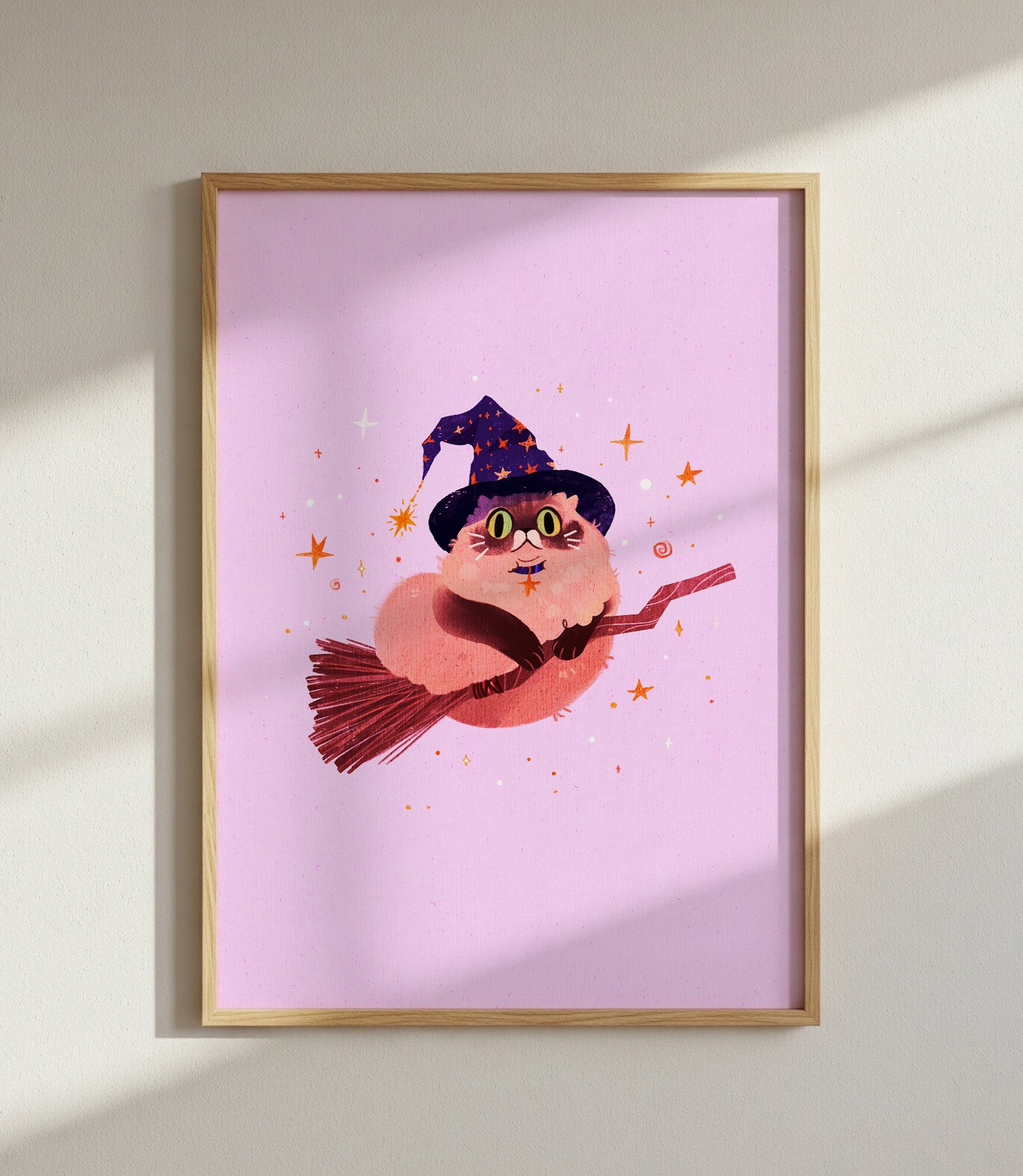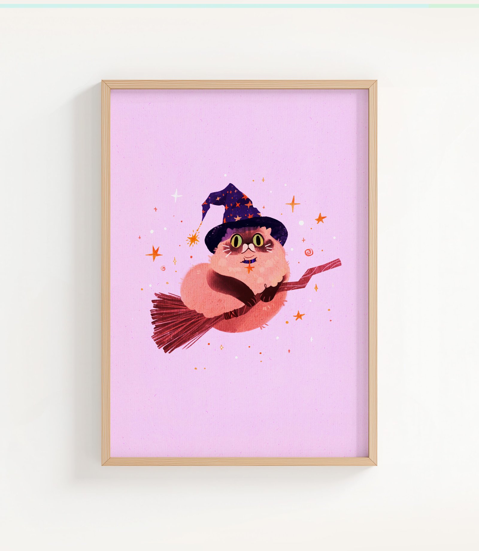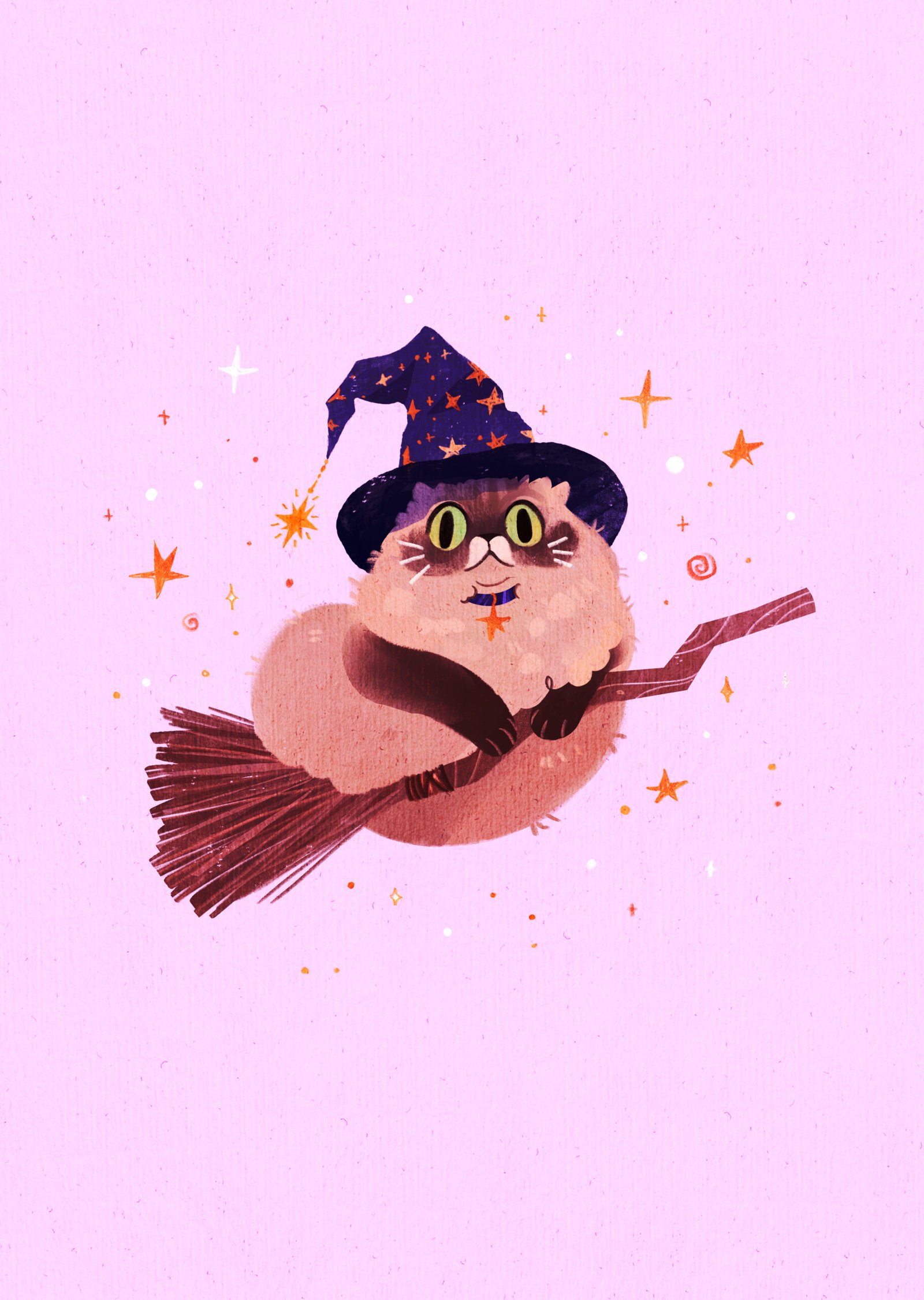 Puszysty kot-czarodziej w wielkim kapeluszu w gwiazdki leci na swojej miotle. Może to magiczna podróż po pyszne jedzonko, albo szybka przejażdżka przed jakimś ważnym spotkaniem? Tak czy siak, ten czarujący kot na pewno się nie nudzi. Poleć z nim w nieznane!